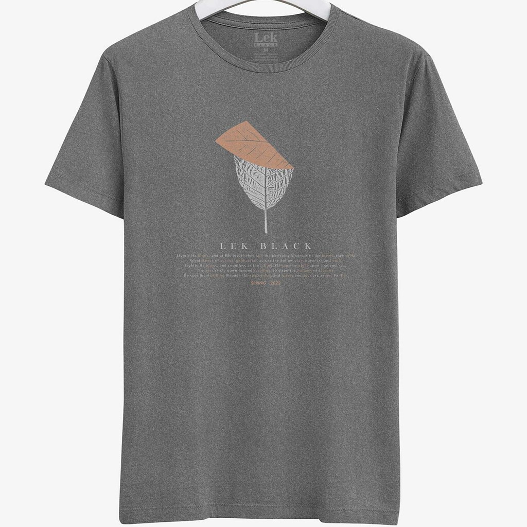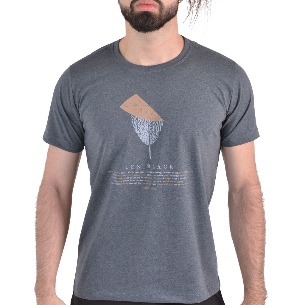 Camiseta Masculina Lek Black Estampada Folha Dobrada na Cor Chumbo - 50% Algodão e 50% Poliéster.